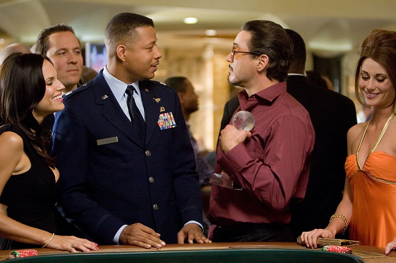 After his capture, he proceeds to build the Mark I Iron Man armor (showing his true intelligence) with the help of another inmate, Yinsen. The conversations they have hold a lot of weight and sway Tony’s personality and how he views his work. That turn is also helped by a great visual of Tony seeing a Stark Industries missile during the attack. As Tony escapes, Yinsen dies. It’s sad to see that Yinsen doesn’t really play a part or is mentioned in later MCU films, since they seemed to bond and really change Tony’s outlook on life. Stark gets picked up later by his best friend, James “Rhodey” Rhodes, played by Terrence Howard. Due to salary disputes, Howard did not return for future MCU movies, replaced by Don Cheadle. The latter seems to have a better rapport with Downey, but I really wish there was an alternate timeline where Howard stayed. Throughout this film, Howard’s Rhodey is more tough and cool, while Cheadle plays him more silly but with tons of heart.
